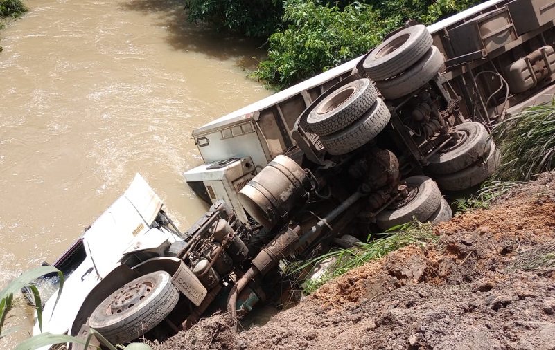 Motorista perde controle de caminhão e cai em córrego na BR 163