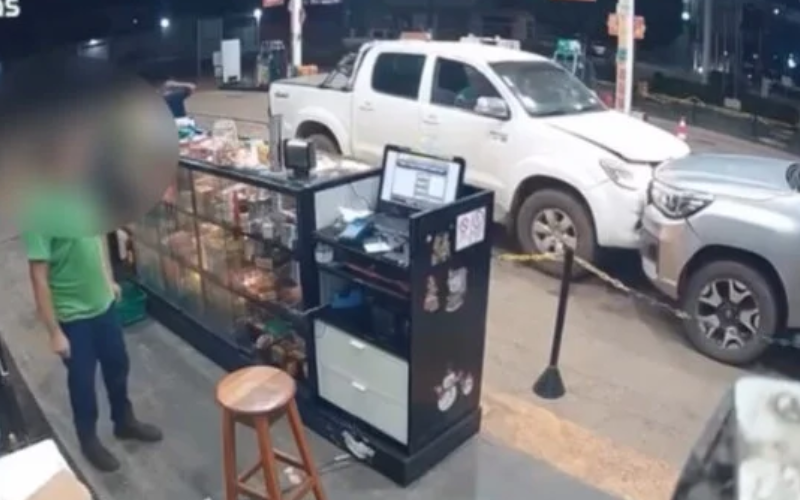 Imagens de câmeras de segurança mostram que o condutor permaneceu parado por alguns minutos em um posto de combustíveis. De forma repentina, ele deu partida no veículo e avançou violentamente contra uma caminhonete que acabava de chegar ao local. Em seguida, engatou a marcha à ré em alta velocidade e voltou a acelerar, colidindo novamente — de maneira ainda mais agressiva — contra uma Hilux que já estava parada.
