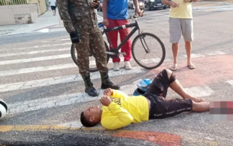 Uma imagem mostra o mototaxista ferido, caído na via, aguardando atendimento médico. Seu capacete próximo, e algumas pessoas no entorno do local do acidente.