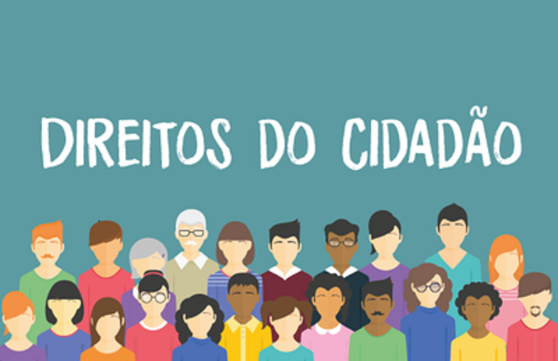 Tela em fundo verde com desenhos de pessoas de todas as cores, idades e tipos com os dizeres Direitos do Cidadão