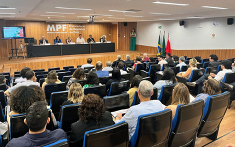 Foto de ambiente de auditório, tirada de frente para o palco, onde se vê três homens e três mulheres sentados em mesa de autoridades; na plateia, há dezenas de pessoas sentadas nas poltronas. Na parede de fundo do palco, há a logo do MPF no Pará e, abaixo do palco à direita há bandeiras do Brasil, do Pará e do MPF