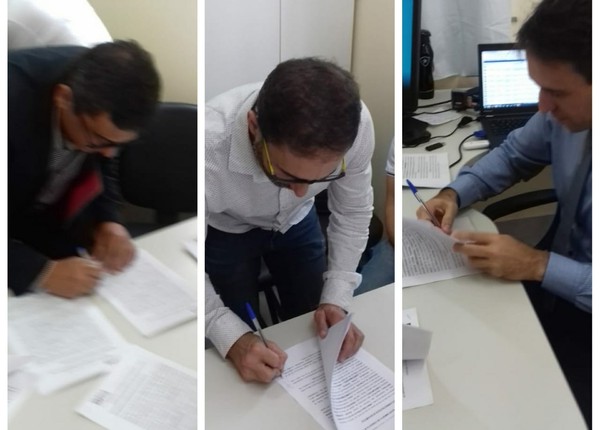 Prefeito Juraci Estevam (PPS), secretário de Educação Adivanildo Lucena Pereira e promotor de Justiça Adleer Calderaro, assinaram o TAC — Foto: Reprodução/Redes Sociais