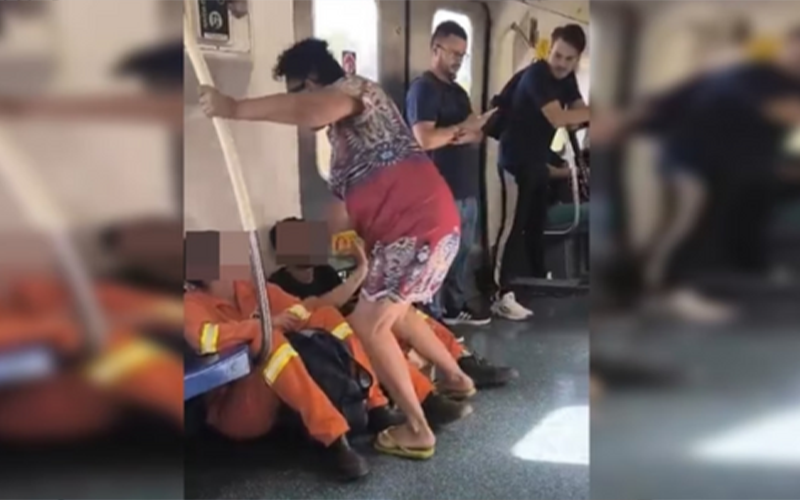 Foto: Reprodução | A ação aconteceu na tarde desta quinta-feira (29) em um trem que seguia em direção à Ceilândia e foi registrada em vídeo por outros passageiros. A mulher discutia com o gari, que estava sentado, e acabou dando um chute e um tapa no rosto do trabalhador. Ele acredita que foi alvo de preconceito por ser gari, destacando que a agressora não quis se sentar ao lado dele.