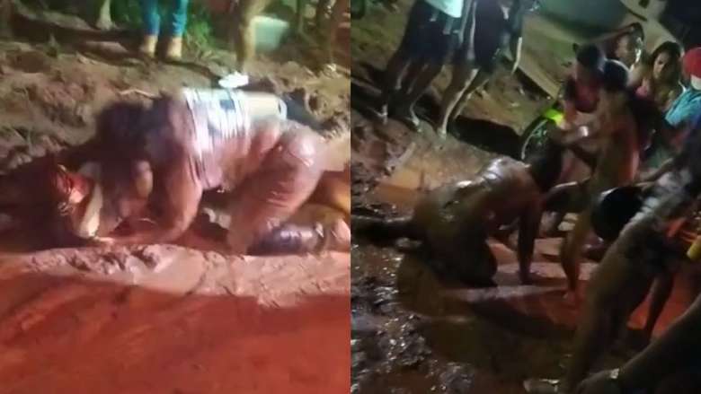 Populares revoltados com a situação, retiraram o homem de dentro do caminhão, e nesse momento, a mulher começou a brigar com a amante do marido. Nas imagens é possível ver que a mulher puxa a outra pelos cabelos e arrasta no meio da lama.