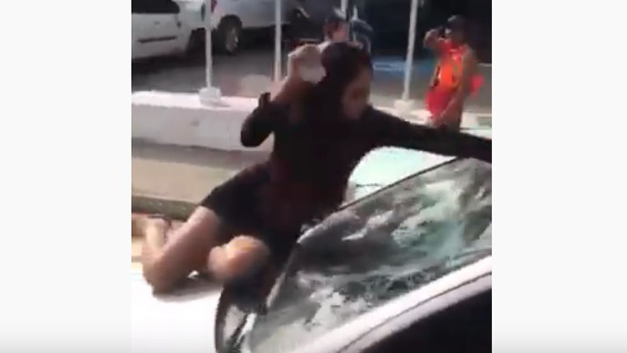 Enquanto o motorista dirigia o carro lentamente, ela ia em cima do veículo com um pedaço de pedra e desferindo vários golpes contra o para-brisa.
