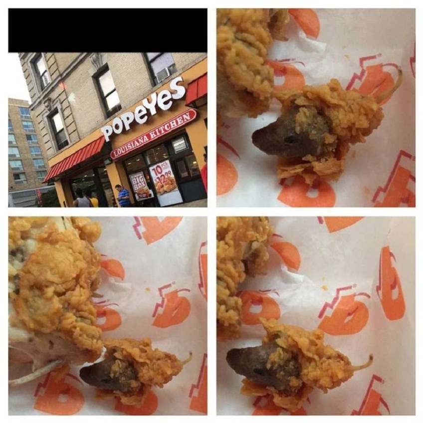 Uma mulher afirma ter encontrado uma cabeça de rato durante uma refeição no último domingo. Rosemary conto no Facebook que foi até a lanchonete Popeyes com a filha, irmã e sobrinha e pediu uma porção de frango frito. O caso ocorreu em Nova York (EUA). As informações são do site Mashable.