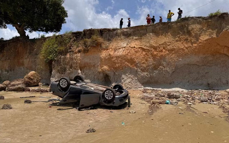Carro capota em barranco da praia Barro Branco, em Outeiro — Foto: Fernando Vidal