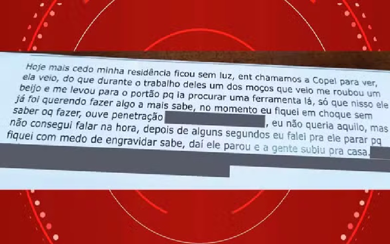“Hoje mais cedo minha residência ficou sem luz, então chamamos a Copel para ver. Ela [a empresa] veio, e durante o trabalho deles um dos moços que veio me roubou um beijo e me levou para o porão, porque ia procurar uma ferramenta lá. Só que, nisso, ele já foi querendo fazer algo a mais. No momento eu fiquei em choque, sem saber o que fazer, houve penetração […], eu não queria aquilo, mas não consegui falar na hora. Depois de alguns segundos eu falei pra ele parar porque fiquei com medo de engravidar, daí ele parou e a gente subiu pra casa”, diz o trecho divulgado do e-mail.