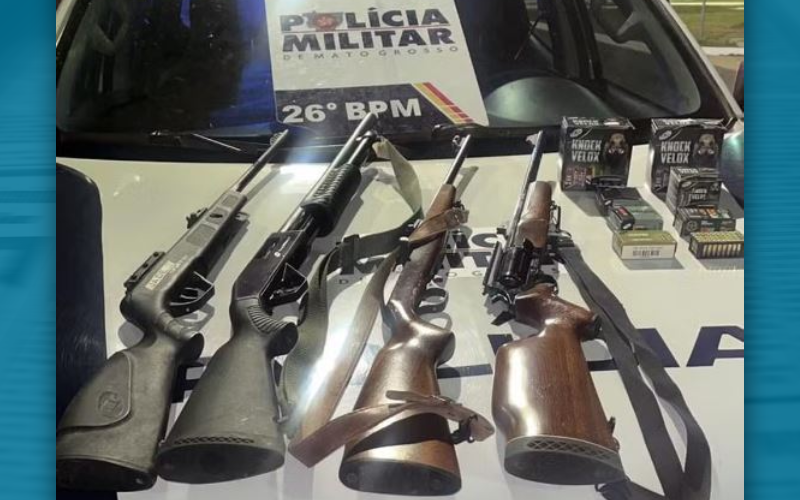 Já no quarto, embaixo da cama, foram localizadas uma espingarda calibre 22, uma calibre 36 e uma espingarda de pressão CBC 5.5.