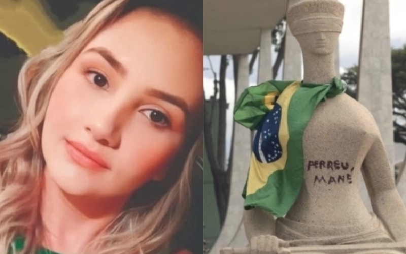 “Quando me deparei lá em Brasília com o movimento, eu não fazia ideia do bem [valor] financeiro e simbólico da estátua. Quando eu estava lá já tinha uma pessoa fazendo a pichação. Faltou talvez um pouco de malícia da minha parte, porque ele começou a escrita e falou assim: ‘Eu tenho a letra muito feia, moça, você pode me ajudar a escrever?’. E aí eu continuei fazendo a escrita da frase dita pelo ministro [Luís Roberto] Barroso”, disse, perguntada por Rafael Henrique Tamai Rocha, juiz auxiliar do gabinete de Moraes.