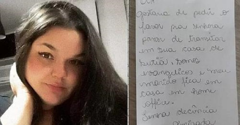 Mulher recebe bilhete de vizinha evangélica para não andar de sutiã em casa