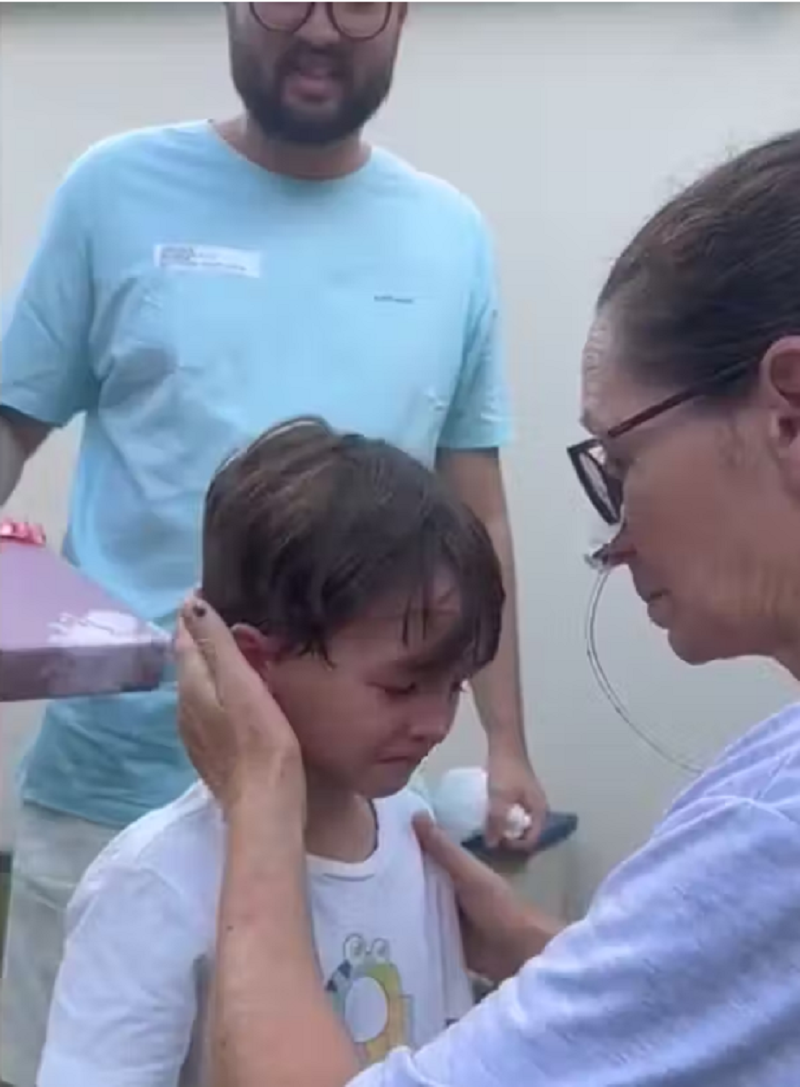 O garotinho chorava bastante e seus pais pediam para ele se acalmar. “Tá tudo bem meu filho, a vovó tá bem”.