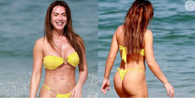 A musa fitness de 33 anos apostou em um micro biquíni amarelo para renovar as marquinhas. Na sequência de imagens, ela surge conversando com os colegas e depois tomando um banho de mar com o marido.