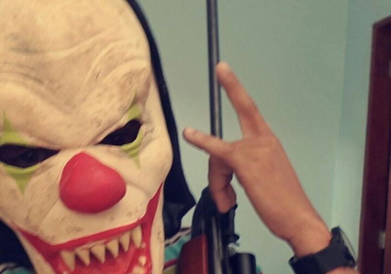 O suspeito, identificado como Allex Augusto da Silva Souza, de 18 anos, aparece em várias fotos segurando armas e usando uma máscara de palhaço.