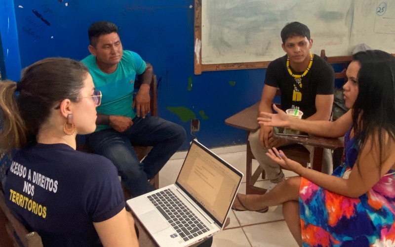 A foto mostra quatro pessoas sentadas em cadeiras, formando um círculo, em reunião em sala de aula. A pessoa à esquerda está usando óculos e uma camiseta azul escura com as palavras “ACESSO A DIREITOS NOS TERRITÓRIOS” impressas nas costas. Ela trabalha em um laptop. Ao lado, um homem de camiseta azul claro e calça jeans está olhando para frente. Ao fundo, outro homem, vestindo uma camiseta preta com um colar colorido e calça bege, observa a mulher à direita, que gesticula com as mãos e usa um vestido colorido. As paredes da sala são azuis, com uma lousa branca ao fundo.