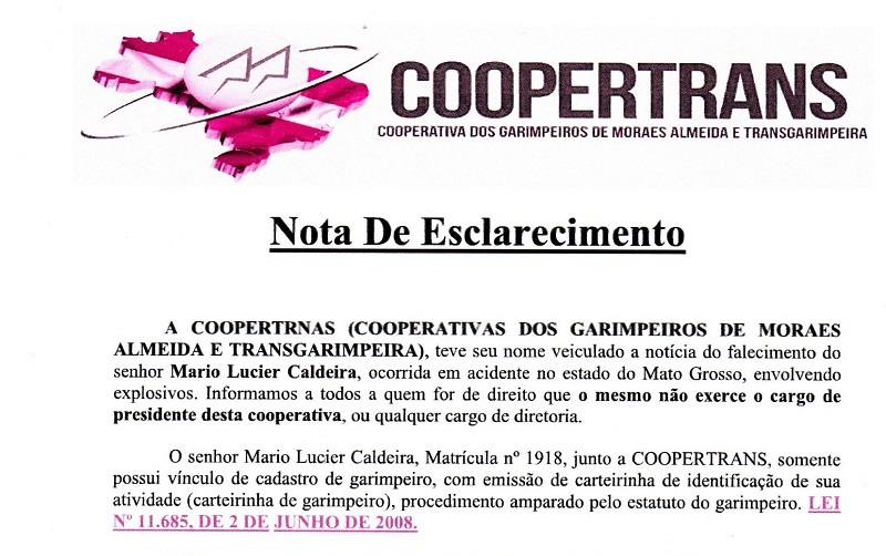 NOTA COOPERTRANS -COOPERATIVA DOS GARIMPEIROS DE MORAES ALMEIDA E TRANSGARIMPEIRA