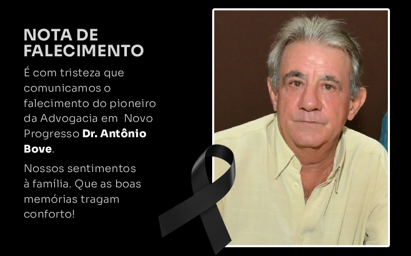 A OAB – Subseção de Novo Progresso/PA divulgou uma nota de pesar pelo falecimento de Dr. Antônio Bove, pioneiro da advocacia no município, ocorrido neste domingo (21).