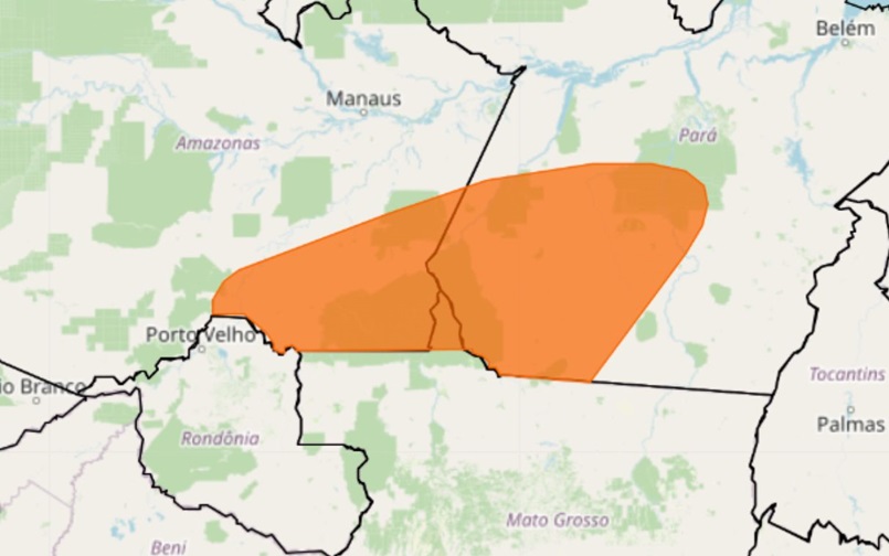 Alerta laranja para temporais, chuva intensa e ventania em partes do AM, PA e MT –