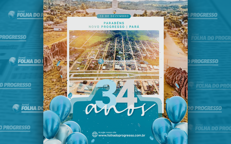 O Jornal Folha do Progresso parabeniza Novo Progresso pelos seus 34 anos, desejando prosperidade, crescimento sustentável e um futuro promissor para todos os seus cidadãos.