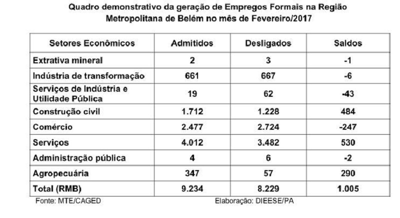 Uma pesquisa feita pelo Departamento Intersindical de Estatística e Estudos Socioeconômicos do Pará (Dieese/PA), através de convênio de cooperação técnica firmado com a Prefeitura Municipal de Belém (PMB), por meio da Secretaria Municipal de Economia (Secon), baseada em dados oficiais do Ministério do Trabalho, mostrou crescimento de 0,30% de geração de empregos formais na Região Metropolitana de Belém (RMB) em fevereiro de 2017.