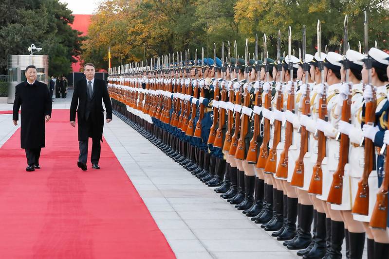 “Bolsonaro e Xi Jinping, presidente da China, passam em revista as tropas chineses, em Pequim: presidente brasileiro deixará a Ásia rumo ao Oriente Médio.| Foto: Isac Nobrega/PR”