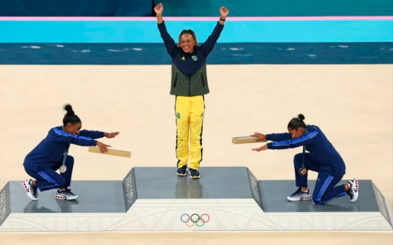 Dona de quatro medalhas em Paris, mesmo número conquistado por Rebeca, Biles foi questionada sobre a reverência à brasileira no momento em que Andrade recebeu o ouro. Sem hesitar, a norte-americana reafirmou o sentimento de respeito pela adversária, que compôs o primeiro pódio composto por ginastas negras da história.