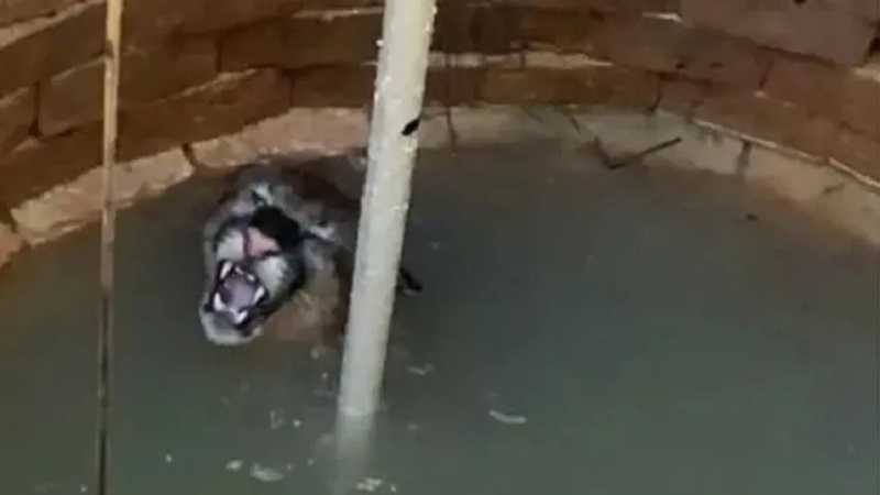 O animal caiu em poço de 9 metros de profundidade; veja o momento do regate.