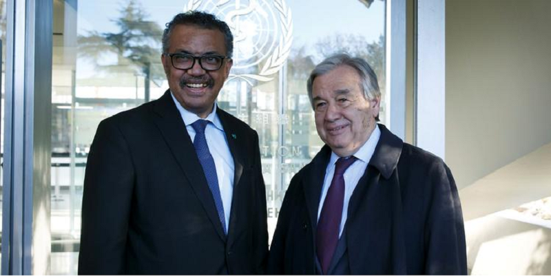 Secretário-geral da ONU, António Guterres, e diretor-geral da OMS, Tedros Adhanom (Foto:Salvatore Di Nolfi/Pool via REUTERS)