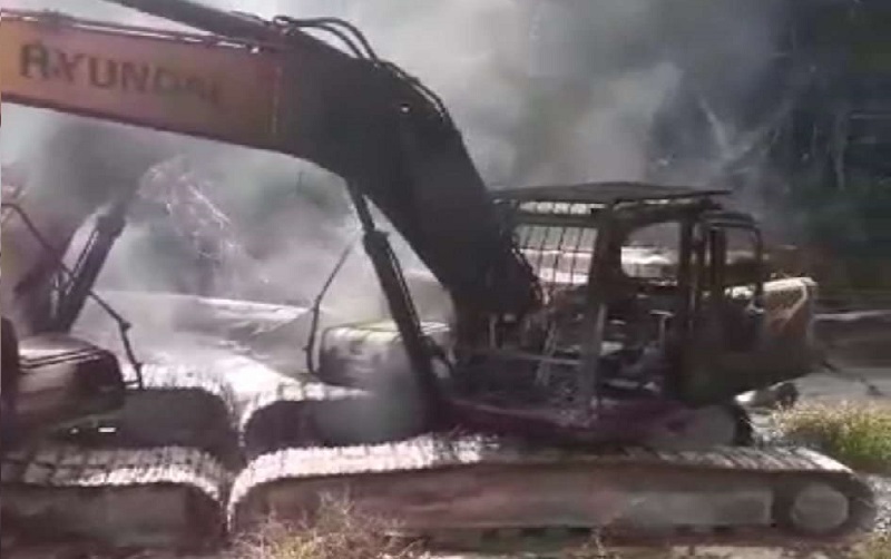 Pelo menos 12 escavadeiras e um trator de esteira foram destruídas nesta segunda-feira (15) -(Foto: Reprodução Youtube) –