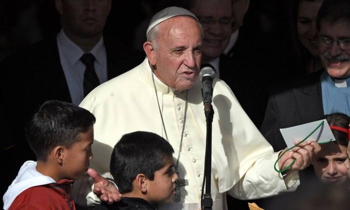 O discurso de Francisco chegou a ser interrompido por uma criança que correu para abraçar o líder religioso e entregar a ele um presente.