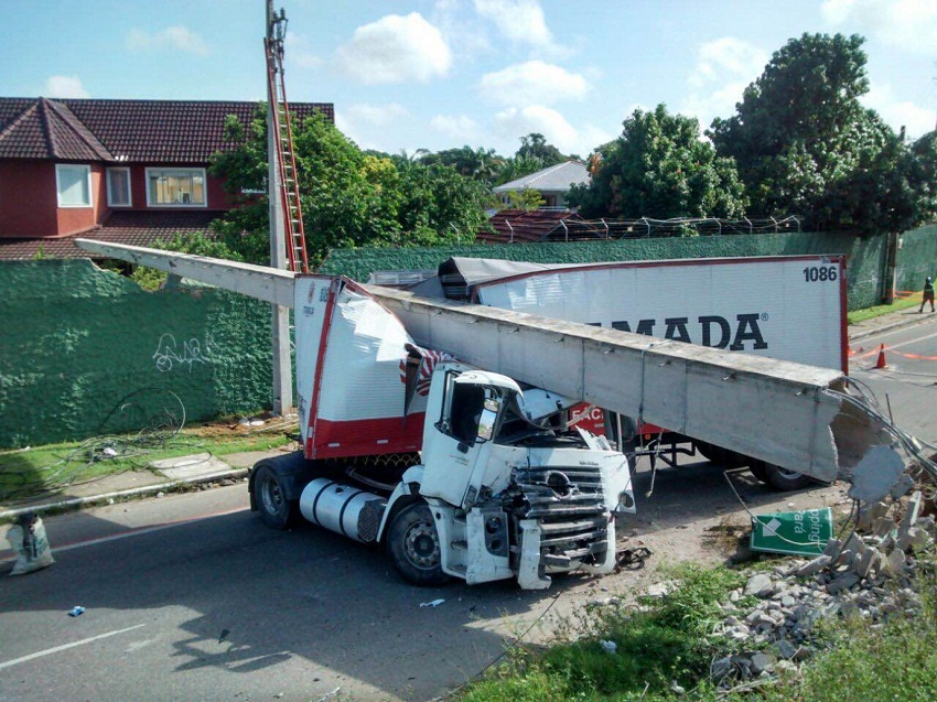 O motorista de um caminhão de cargas perdeu o controle e se chocou contra um poste no cruzamento das avenidas Centenário e Transmangueirão na madrugada desta quarta-feira (20). A suspeita é a de que o motorista tenha dormido ao volante ao tentar subir o elevado.