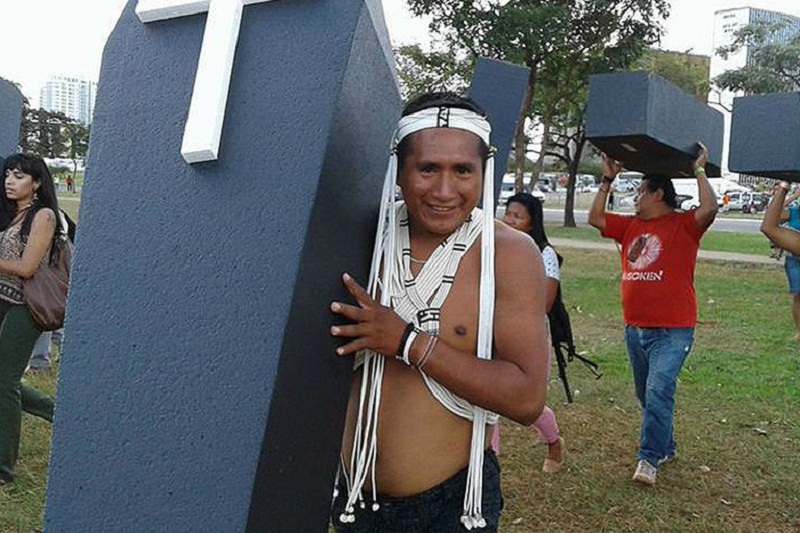 Paulo Marubo no Acampamento Terra Livre, em Brasília, em protesto contra a violência que atinge os povos indígenas