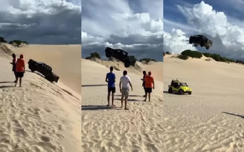 O vídeo (veja mais abaixo) mostra a picape média “voando” após arrancar para subir uma duna íngreme da praia de Canoa Quebrada, em Aracati. Ao chegar no topo, a Ranger Raptor decola e alcança altura bem elevada.