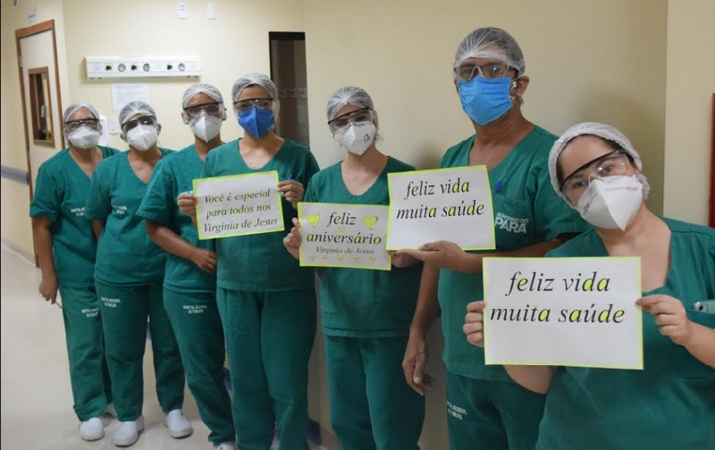 Para celebrar, os profissionais se reuniram para cantar parabéns, além de presentear Virginia com um bolo, após a liberação do alimento na dieta hospitalar. Os colaboradores também usaram plaquinhas com as frases: “Feliz Aniversário”, “Feliz Vida”, “Muita Saúde” e “Você é especial para todos nós”.