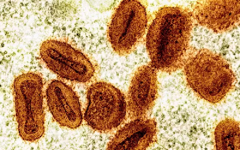 Imagem de microscópio eletrônico mostra partículas do vírus da Mpox, em laranja, encontradas dentro de células infectadas, em verde. — Foto: NIAID