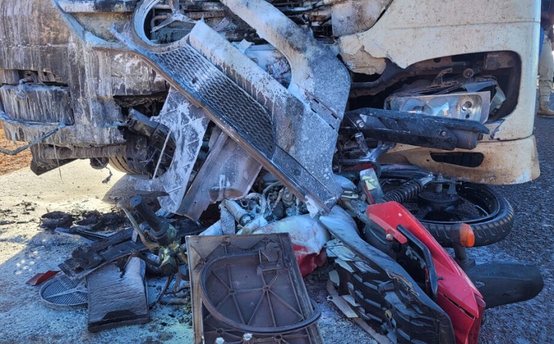 Motocicleta onde estavam as vítimas foi arrastada por uma carreta e na sequência pegou fogo – (Foto:Reprodução /IDEST)