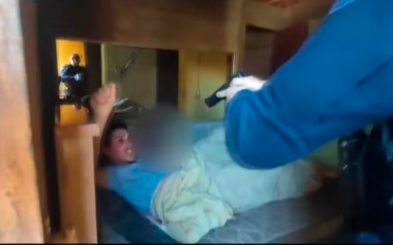As imagens mostram o momento em que guardas chegam à casa. Em seguida, eles arrombam a porta, encontram o homem deitado e mandam ele largar a criança, que também está na cama.