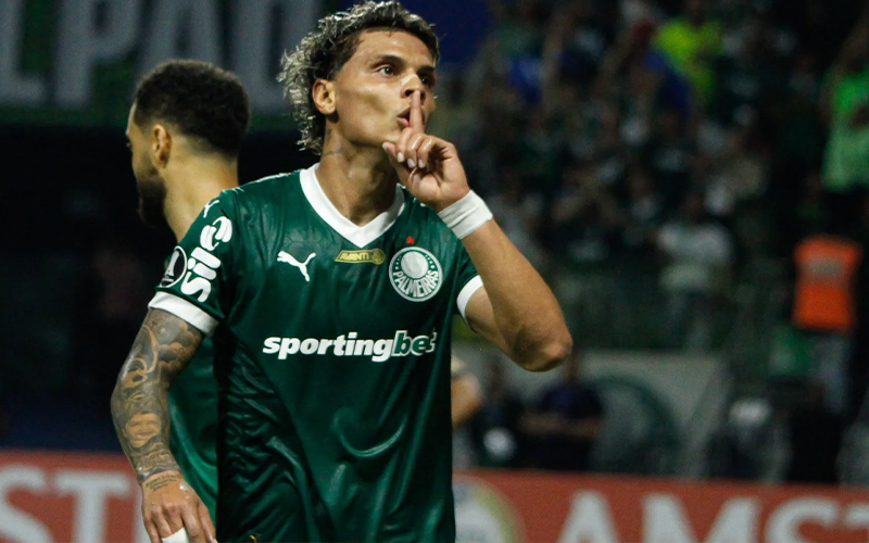 Richard Ríos manda torcida calar a boca após marcar gol do Palmeiras contra o Cerro Porteño • VINICIUS NUNES/AGÊNCIA F8/ESTADÃO CONTEÚDO