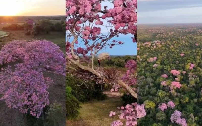Imagens aéreas captadas pelo empresário Renato Rondon mostram o Pantanal tingido de rosa com a florada dos ipês.