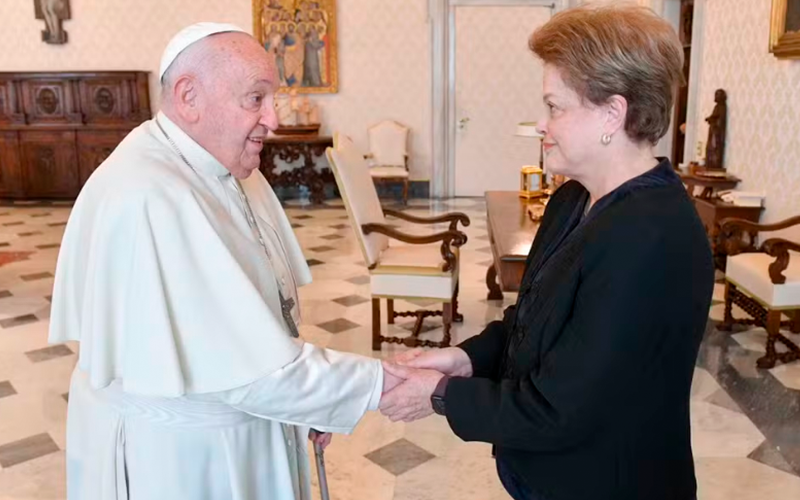 Segundo o Vaticano, a ex-presidente deu ao papa o livro “Theodoro Sampaio. Nos sertões e na cidade”, de Ademir Pereira dos Santos e recebeu de presente de Francisco a encíclica “Laudato si”, a exortação apostólica “Laudate Deum” e uma escultura em bronze