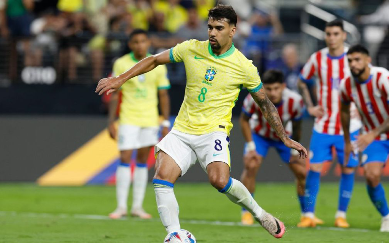 Aos 30 minutos surgiu a chance mais clara de virada para o Brasil. Vitor Roque pressionou Sassi na área e sofreu pênalti. Lucas Paquetá assumiu a cobrança e bateu por cima do gol, desperdiçando a possibilidade de colocar a Seleção na dianteira.