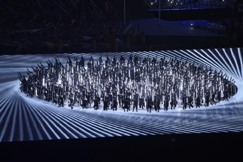 A organização da cerimônia de abertura usou muitos recursos de projeção de luz para simular cenários e interagir com os figurantes
