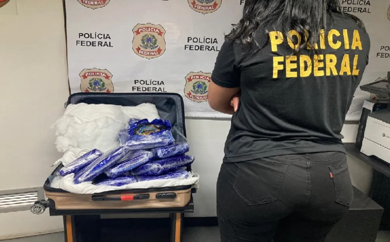 Segundo a Polícia Federal, havia 10 tabletes da droga entre as plumas em duas fronhas dentro na mala despachada.