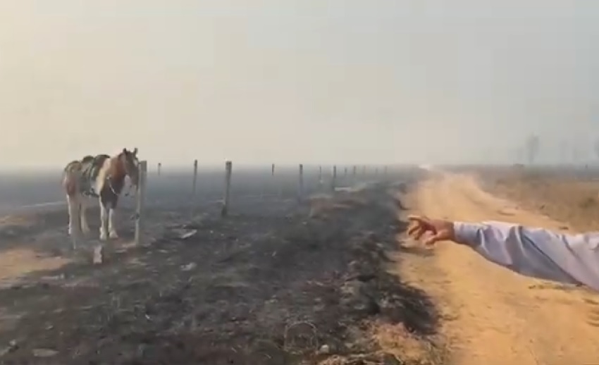 Os pecuaristas gravaram vídeos e postaram nas redes sociais, um deles o fazendeiro Marcelo mostra um trator de esteira queimado na fazenda e acusa os fiscais ambientais que estiveram na propriedade em ter colocado fogo – o trator estava na mata- , sem controle o fogo se alastrou e queimou toda pastagem da propriedade e do vizinho.