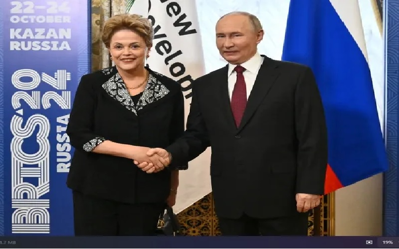 Dilma Roussef, presidente do Banco dos Brics, se encontra com Vladimir Putin, presidente da Rússia na reunião de cúpula em Kazan — Foto: Kristina Kormilitsyna/ Brics