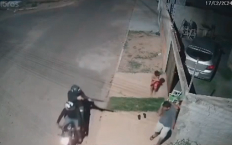 Nas imagens é possível ver que João estava em frente de casa junto com a esposa e o filho, que brincava com uma bola, quando os três são surpreendidos com a chegada de dois homens em uma moto. (Veja vídeo acima)