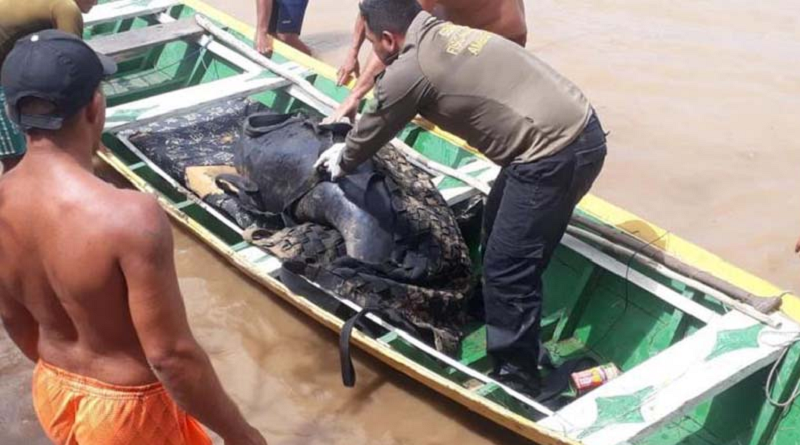 O animal foi encontrado preso em malhadeira na comunidade Piracauera de Cima, região de várzea.