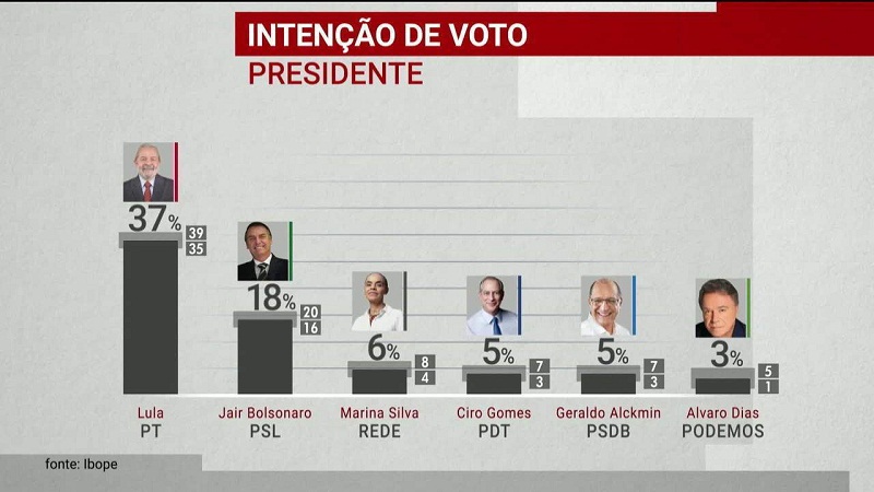 Pesquisa Ibope: Lula, 37%; Bolsonaro, 18%; Marina, 6%; Ciro, 5%; Alckmin, 5%