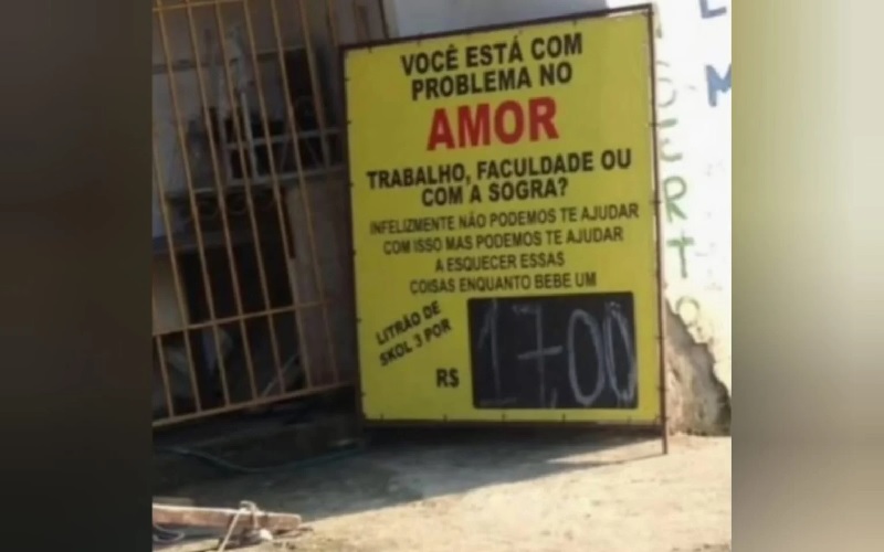 Na placa, fixada no portão com grade, a mensagem dizia: “Você está com problema no amor, trabalho, faculdade ou com a sogra? Infelizmente não podemos te ajudar com isso, mas podemos te ajudar a esquecer essas coisas enquanto bebe 3 litrões de Skol por R$ 17,00.”