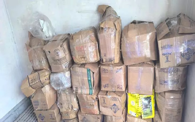 O material apreendido envolveu, além de 24 caixas de 25 kg cada, com cerca de 600 kg de cocaína; 101 barris de hipoclorito de sódio; um caminhão, entre outros itens, como relógio; cordão; chaves; óculos; celular e sete notas fiscais.